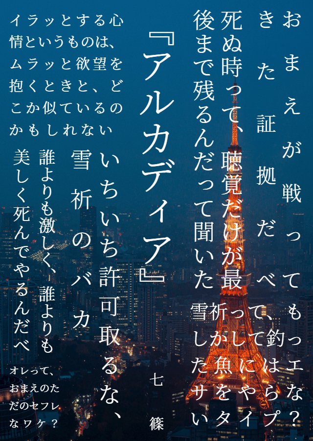 同人誌『アルカディア』イベント頒布用エントリです。 通販はBOOTHで行います。 【匿名発送】アルカディア(匿名でやりとりできます) 【通常発送】アルカディア(送料がお値打ちです) 各自、ご都合の良い方をご利用下さいませ。 *** 0625イベント記念展示(短い小説)できました。雪大です。 「未来図」 イベント後にも置いておくので、おヒマな時間に読んで下さい。 *** また遊びに来てくださいね! 会場をあやしい姿でウロウロしてると思うので、適当に捕まえて下さい。 本当は25日の夜は某老舗ロックバンドのライブ参戦予定だったけどチケット取れなかったんですよ。かなしみー 魂だけ恵比寿方面に飛ばします!ヒュンヒュン 七篠 https://twitter.com/nanashino_m PR 2023/06/25 BGwebオンリーイベント「We are awesome!」に参加します。