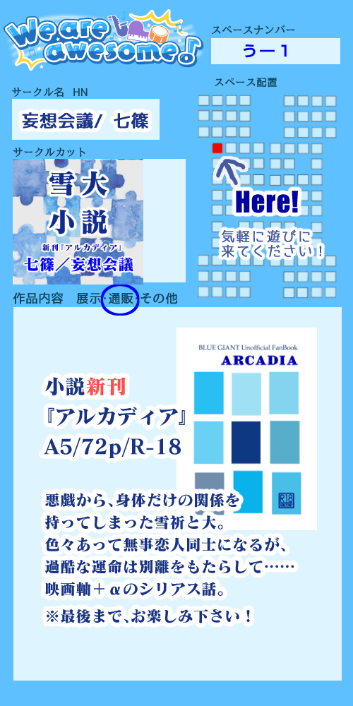 スペースNo.う-1「妄想会議」雪大のスペースです。 久しぶりのイベント参加です! webオンリーにサークル参加するのは初めてでちょっと緊張しますが、 ぜひお立ち寄りくださいませ。 【新刊】 『アルカディア』雪祈x大(R-18) シリアス小説短編集。 A5サイズ / 72ページ webオンリーなので通販のみの頒布となります。 詳細は当日のイベントページと当blogの同人誌のエントリで確認してください。 →06/26追記: イベントは終了しましたが、まだ本の在庫はありますのでこちらからどうぞ。 当日は適当に会場をうろうろしてると思うので、チャットとか伝言板でやりとりしたいですね。 雪大雪のお話したいです! このジャンルで初参加&初同人誌なので色々わからん(本当にわからん……)状態ですが; よろしくお願いします! 七篠 06/25 「We are awesome!」(BG二次創作webオンリー)で発行予定の