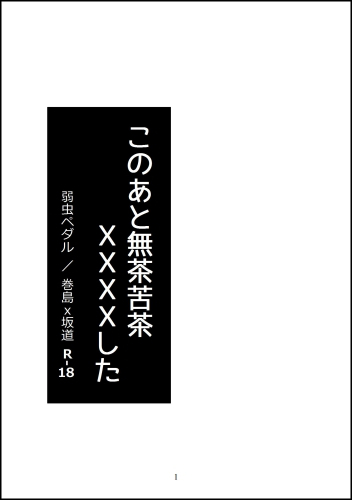 巻島x坂道(R-18) A5 / コピー / 8ページ / 無料配布本 巻島と付き合っている坂道が、古賀に軽くからかわれる。 それに嫉妬した巻島は……。 2014/08/16 コミックマーケット86発行 →サイトにも掲載しています。こちらからどうぞ (下の方の「R-18小説」のカテゴリにあります) PR | カテゴリー