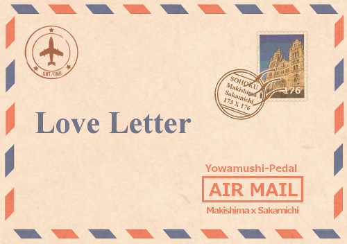 「ガラス屋本舗」はりさんと「妄想会議」七篠の合同スペースです。 七篠の新刊『ラブレター』巻島x坂道 手紙を模したリーフレットに載せた短い小説です。 エアメール風 封筒入り A5x6枚 一部¥100(予定) 【既刊】すべて巻坂 / 小説 / R-18 です 全開ケイデンス3新刊『ヒメ★ハジメとポラロイド』、 巻坂再録『はじまりのかおり』『魔法の★ステッキ』も頒布します。よろしくお願いします! PR | カテゴリー
